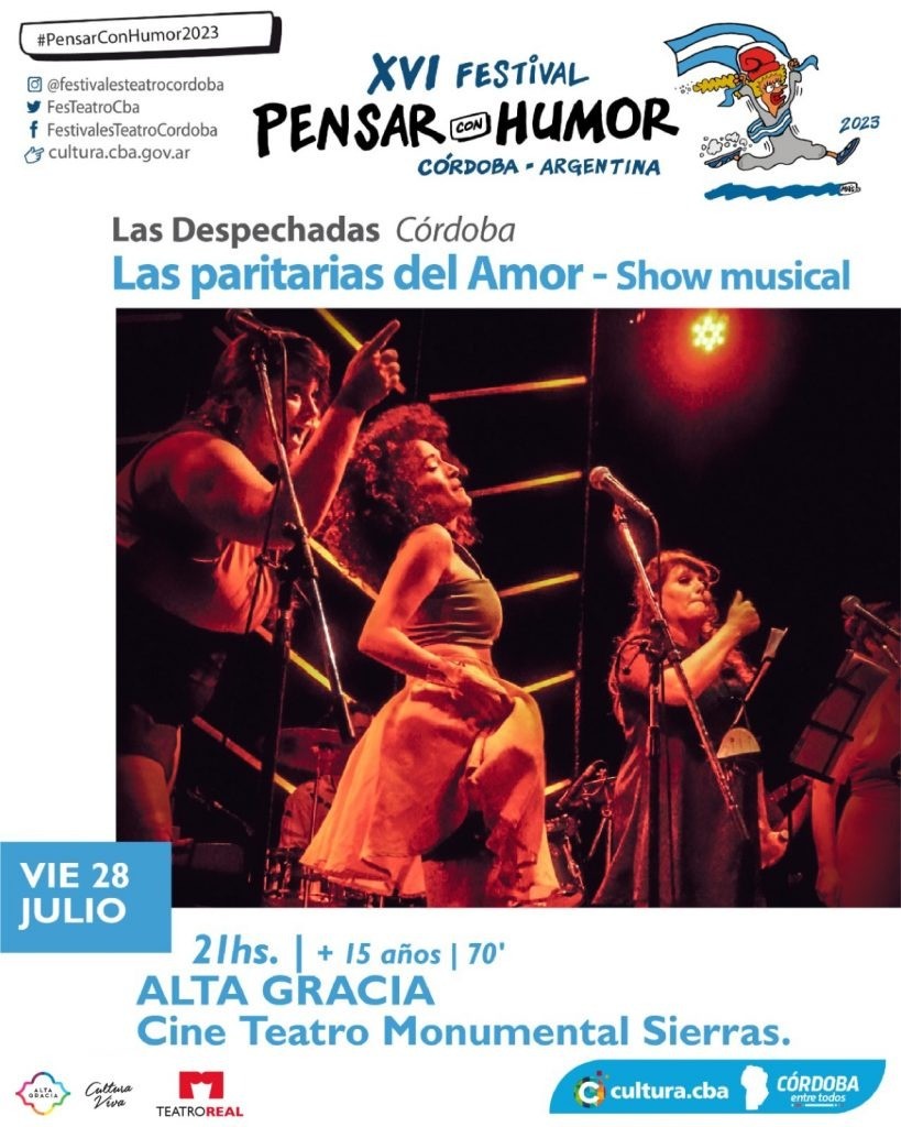 +21hs Musical: “Las Paritarias del Amor”. En el marco del XVI Festival Pensar con Humor de la Agencia Córdoba Cultura, el grupo teatral “Las Despechadas” llega al Monumental con un divertido espectáculo en el que, “enfiestadas”, transitan por géneros como la cumbia, el bolero, el tango, la salsa, el guaguancó, el rock y el vals para “exorcizar las penas del amor” y, sobre todo, “reírnos de la mueca del dolor”. ¡IMPERDIBLE! Cine Teatro Monumental Sierras, Belgrano 249. Entrada libre y gratuita.