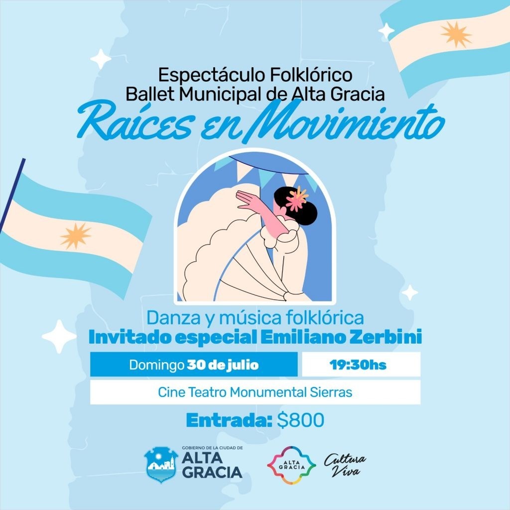 +19.30hs Raíces en Movimiento: El Ballet Municipal de Alta Gracia brindará un gran espectáculo folclórico para disfrutar de toda nuestra cultura nacional, con la participación especial del gran Emiliano Zerbini. Entradas a la venta en Cine Teatro Monumental Sierras.