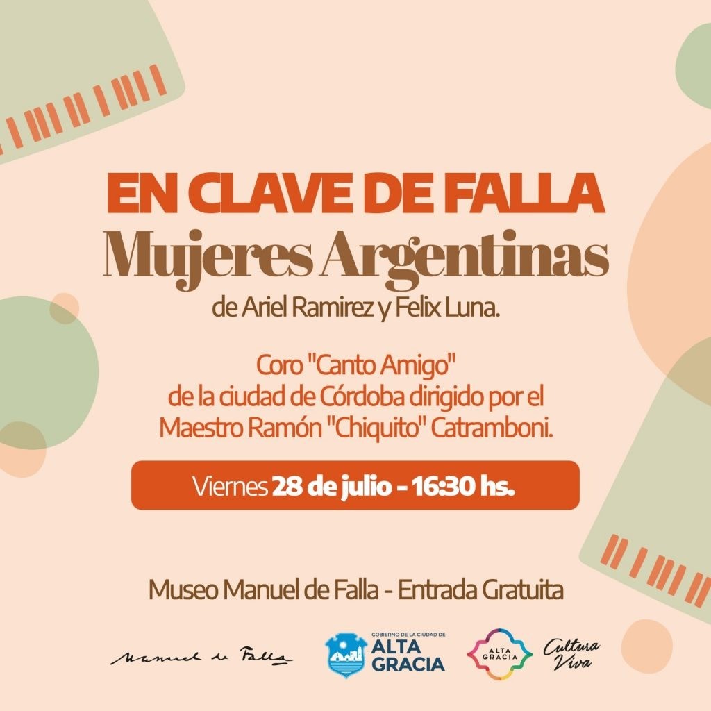 +16.30hs En Clave de Falla: Mujeres Argentinas. El Coro “Canto Amigo”, con dirección del Maestro Ramón “Chiquito” Catramboni, interpretará la obra cumbre que Ariel Ramírez y Félix Luna eternizaron junto a Mercedes Sosa. Museo Manuel de Falla, Bv. Pellegrini 1011.