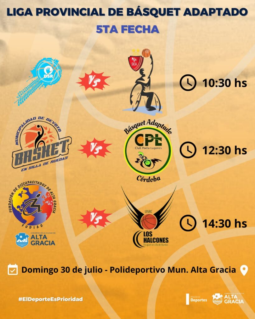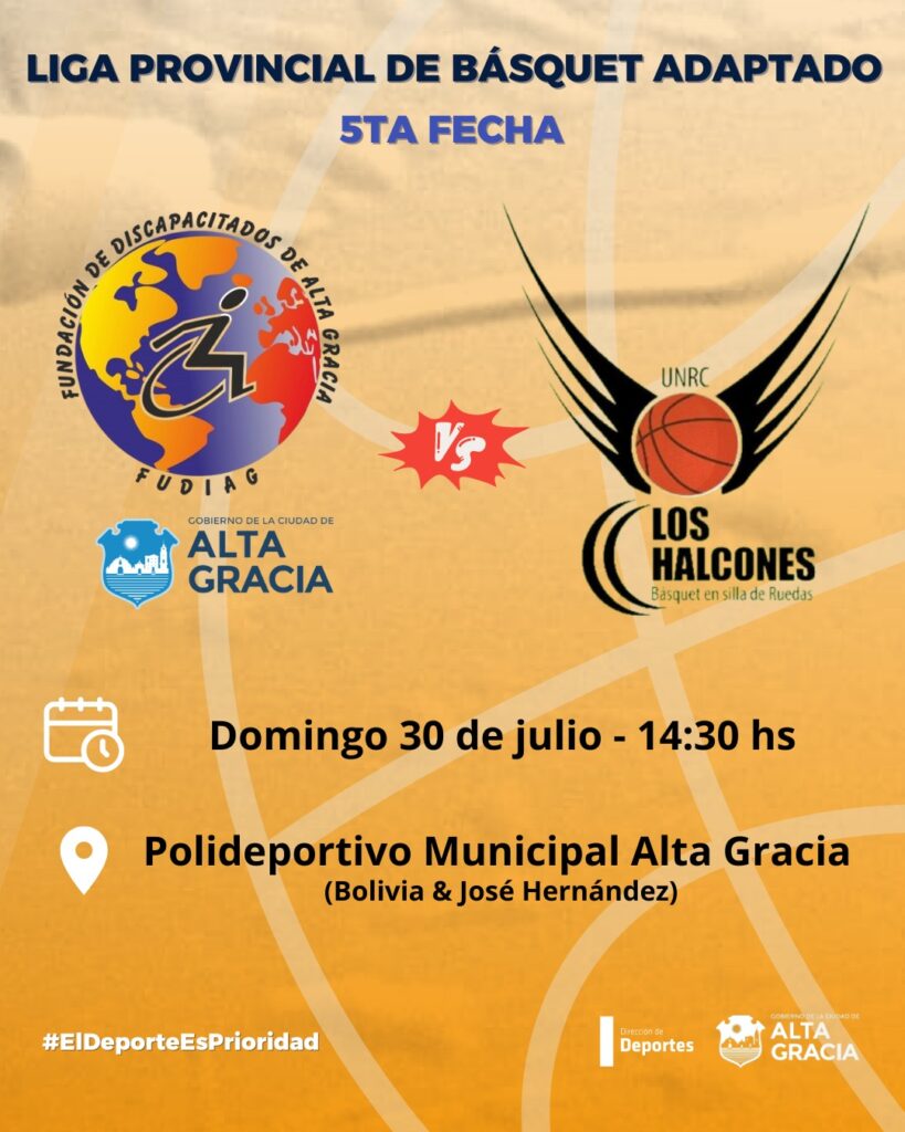 +Todo el día: Liga Provincial de Básquet Adaptado. El Polideportivo Municipal recibe la quinta fecha de la Liga Provincial de Básquet Adaptado, con partidos que se disputarán desde las 10.30hs.. En dicha jornada, los locales de FUDIAG – MAG recibirán a Halcones de Río Cuarto en el partido que se disputará desde las 14:30 hs, cerrando la fecha. ¡Esperamos a la hinchada altagraciense a sumarse, para apoyar a nuestros jugadores! La programación completa se encuentra en altagracia.gob.ar/agenda