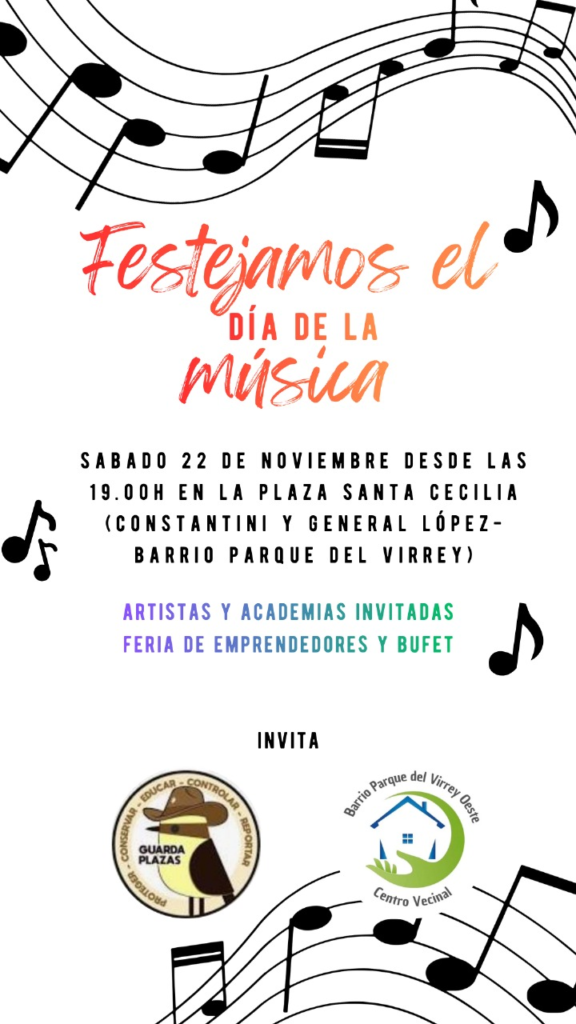 Este sábado 22 de noviembre, desde las 19:00, la Plaza Santa Cecilia —ubicada en la intersección de Intendente Constantini y General López, en barrio Parque del Virrey— será escenario de una jornada especial con motivo del Día de la Música. La actividad, organizada por el Centro Vecinal de barrio Parque del Virrey (Oeste) y el grupo Guardaplazas, busca reunir a la comunidad en un evento que combinará música, danza y propuestas culturales.