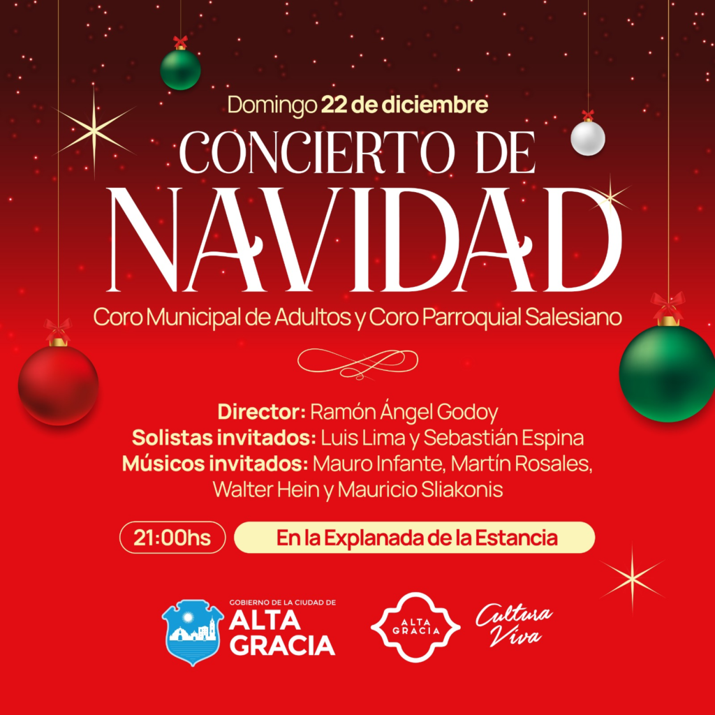 El Gobierno de Alta Gracia invita a toda la comunidad al gran concierto navideño que tendrá lugar el próximo domingo 22 de diciembre a las 21hs en la explanada del Museo de la Estancia Jesuítica.