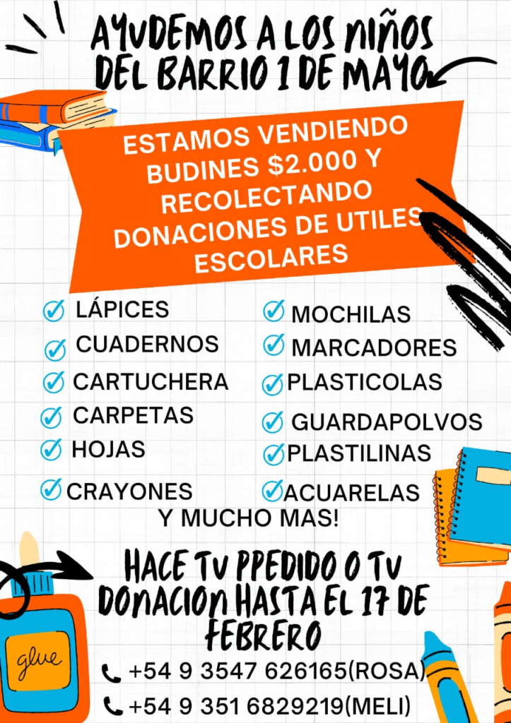 Rosa y Meli, vecinas de Alta Gracia decidieron ayudar a los niños del barrio 1° de Mayo en esta vuelta al cole, recolectando donaciones de útiles escolares como lápices, cuadernos, cartucheras, carpetas, hojas, crayones, mochilas, marcadores, plasticolas, guardapolvos, plastilinas, acuarelas, y cualquier elemento más que las personas deseen donar.