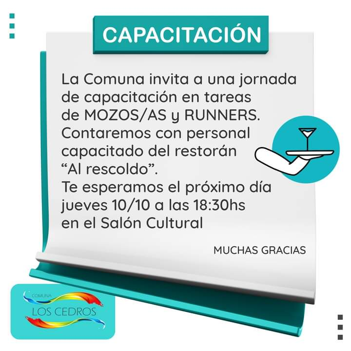 Este jueves 10 de octubre comenzará en la localidad de Los Cedros una capacitación en tareas de Mozo y Runners.