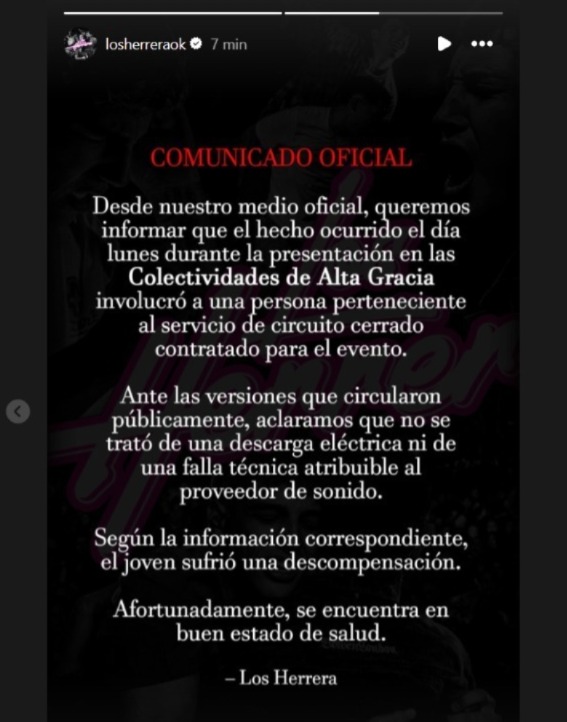 Luego del comunicado oficial difundido en las últimas horas por el grupo musical Los Herrera, donde se aclara que el hecho ocurrido durante su presentación en las Colectividades de Alta Gracia involucró a una persona del servicio de circuito cerrado y que no se trató de una descarga eléctrica ni de una falla técnica, desde Mi Valle Medios destacamos que esa fue la información brindada oportunamente por nuestro medio.