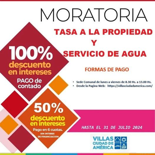 Con importantes descuentos y quitas de hasta el 100% de los intereses y recargos, continúa vigente hasta el 31 de julio la Moratoria 2024 en Villas Ciudad de América.