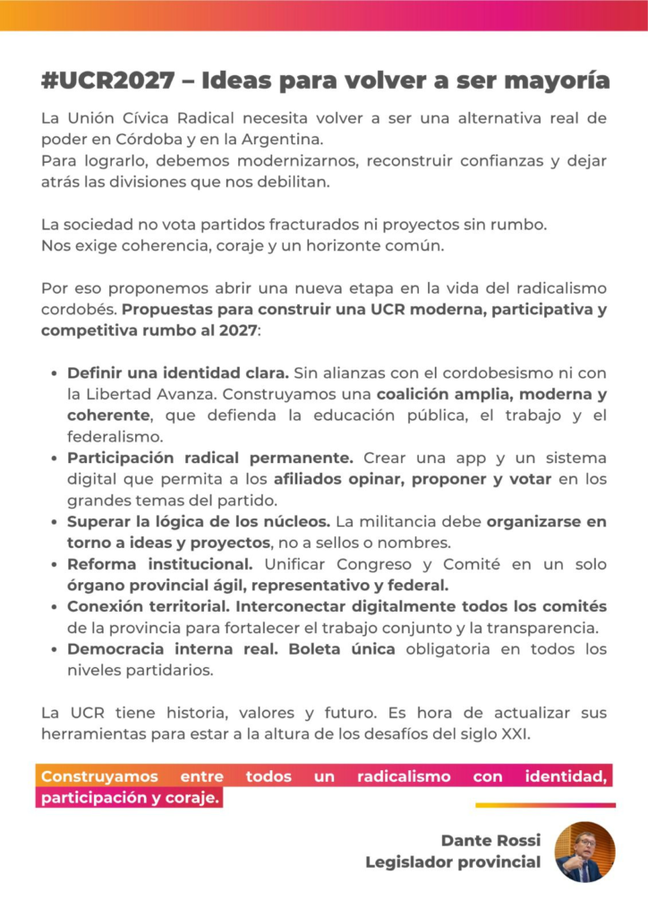 “La UCR tiene historia, valores y futuro. Es hora de actualizar sus herramientas para estar a la altura de los desafíos del siglo XXI. Construyamos entre todos un radicalismo con identidad, participación y coraje”, concluye Rossi.
