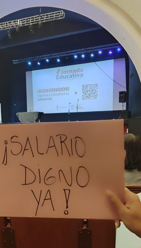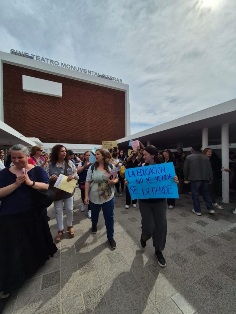 “La educación no se vende, se defiende”, haciendo visible su malestar por la situación actual del sector y por la organización de la jornada en el marco de la Formación Situada Docente.