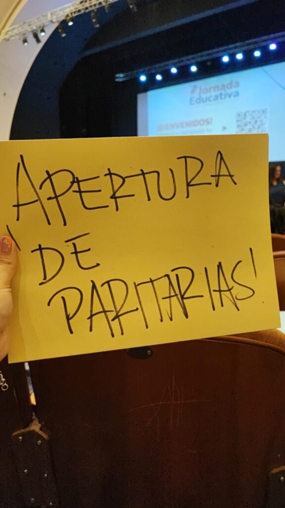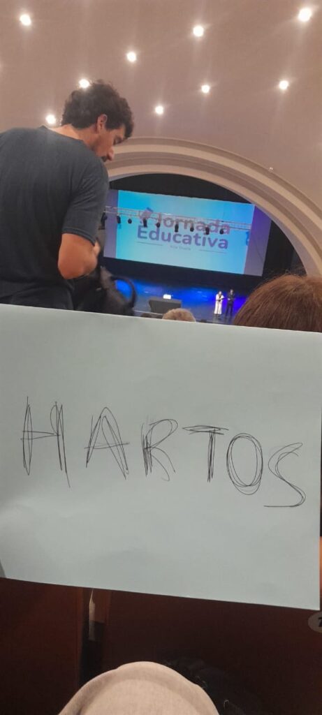 Si bien la mayoría de los asistentes participó con normalidad en las distintas actividades, el gesto simbólico de un grupo de educadores marcó un contrapunto dentro del encuentro, mostrando la diversidad de miradas que atraviesa hoy al sistema educativo.