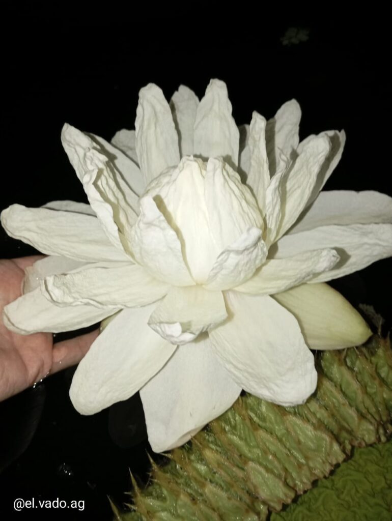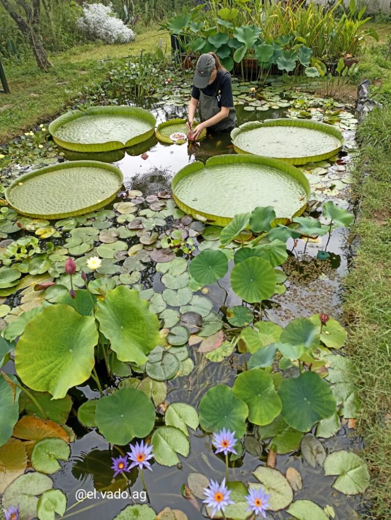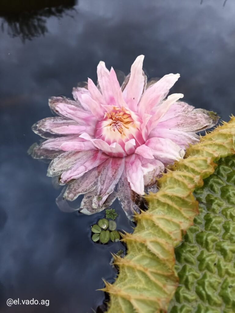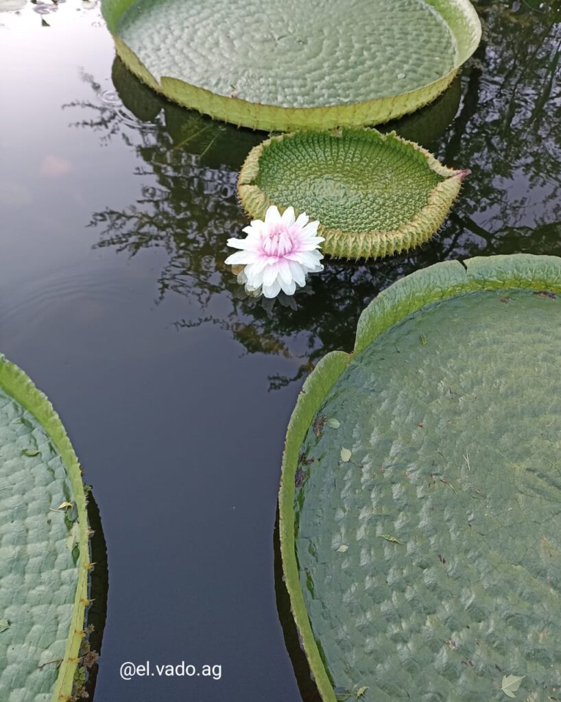 Las hojas pueden alcanzar casi dos metros de diámetro, dependiendo de la variedad. En el envés presentan espinas, un detalle que sorprende tanto como su tamaño. “Es una planta de porte muy grande. Las hojas parecen platos gigantes flotando en el agua”, describe.