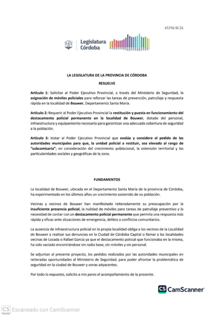 La situación de inseguridad en Bouwer volvió a instalarse en la agenda política provincial. Un proyecto de resolución presentado en la Legislatura de Córdoba solicita al Poder Ejecutivo el refuerzo urgente del servicio policial en la localidad, mediante la asignación de móviles, la restitución del destacamento permanente con personal operativo y su elevación al rango de subcomisaría.