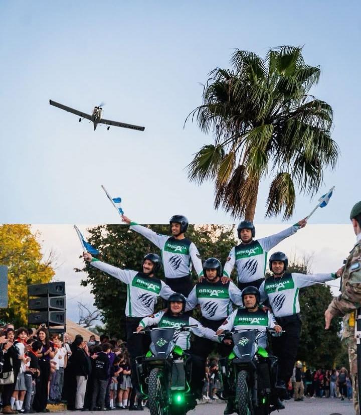 Uno de los momentos más impactantes de la jornada fue la destreza aérea del Aeroclub, con aviones que sobrevolaron la zona realizando maniobras que despertaron aplausos y asombro en todo el público presente, al igual que la Brigada Puma, que llevó adelante unis imponentes cuadros artísticos con sus motos.