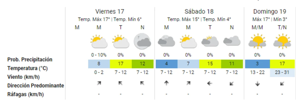 Para hoy, la máxima se estima en 17 grados, aunque podría bajar unos puntos mañana.