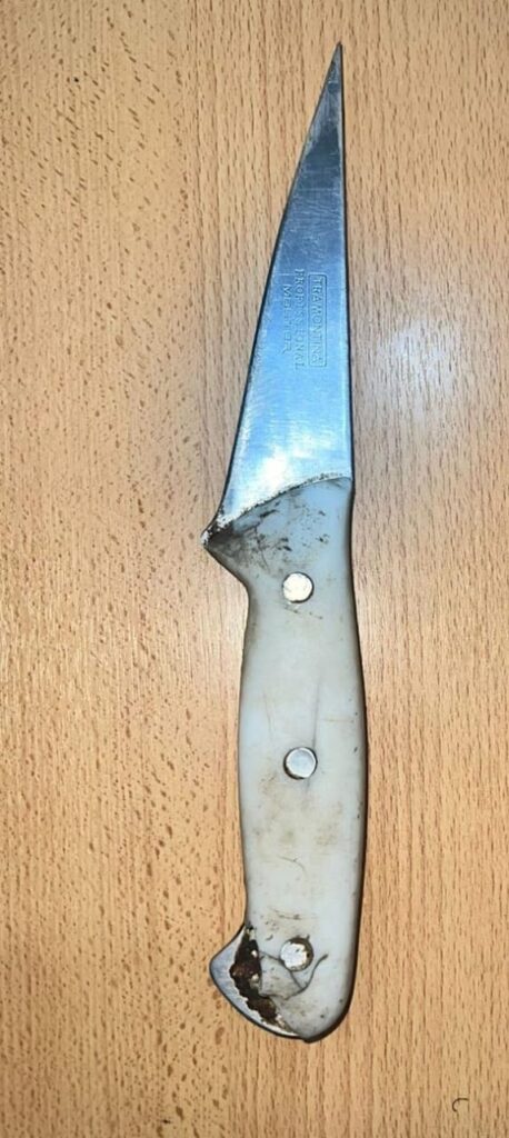 Según su testimonio, el intruso portaba un un cuchillo que luego fue fotografiado y presentado como prueba. A pesar de eso, y de haber sido reducido momentáneamente por la intervención policial, el agresor fue llevado… a su propia casa.