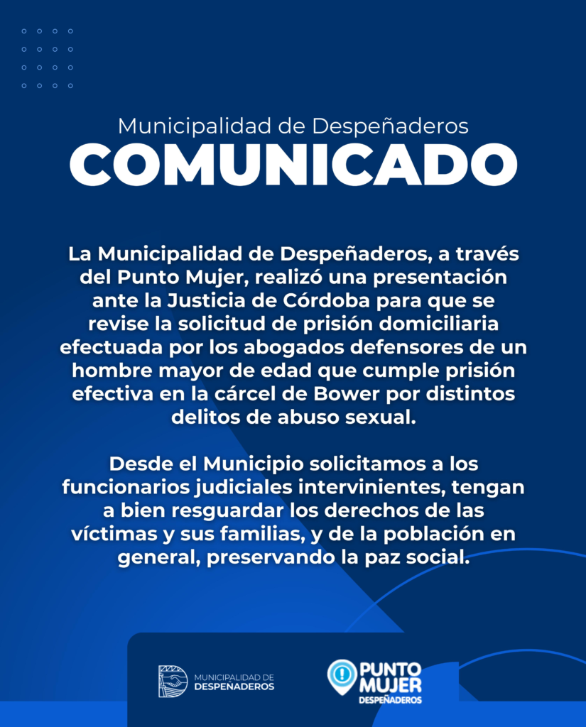 “La Municipalidad de Despeñaderos, a través del Punto Mujer, realizó una presentación ante la Justicia de Córdoba para que se revise la solicitud de prisión domiciliaria efectuada por los abogados defensores de un hombre mayor de edad que cumple prisión efectiva en la cárcel de Bower por distintos delitos de abuso sexual.