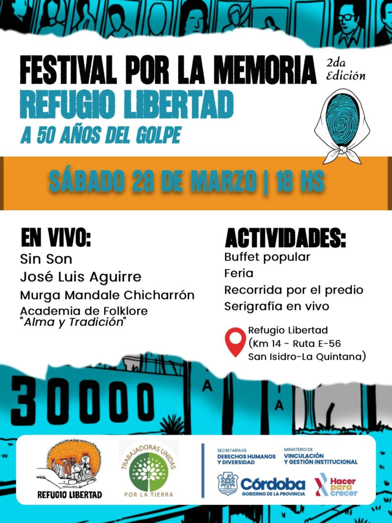 En el marco de las actividades por Memoria, Verdad y Justicia, el Refugio Libertad llevará adelante la segunda edición del Festival por la Memoria, una jornada cultural y comunitaria que busca reflexionar y mantener viva la memoria colectiva al cumplirse 50 años del Golpe de Estado en Argentina.