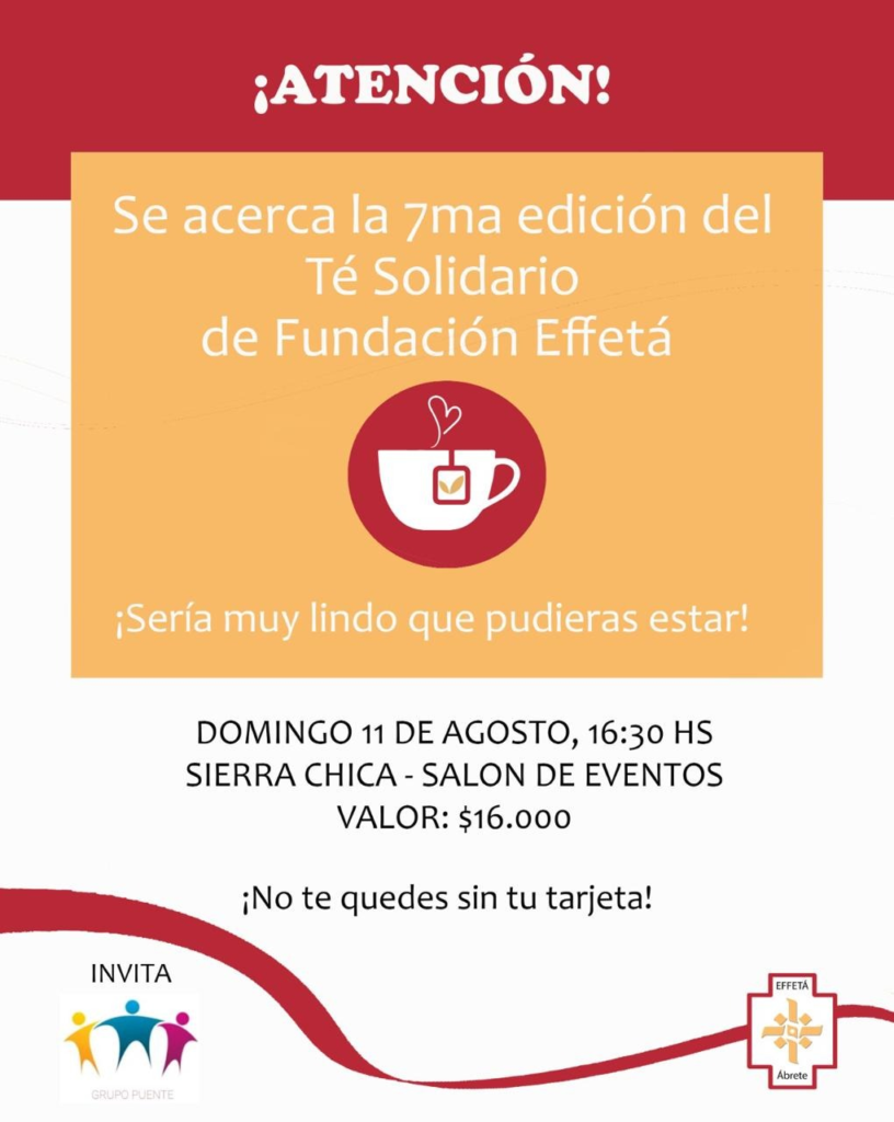 Este domingo 11 de agosto, la Fundación Effetá de la ciudad de Alta Gracia organiza un “Té Solidario”. Esta será la séptima edición y se realizará a las 16.30hs en el Salón de Eventos de Sierras Chicas.