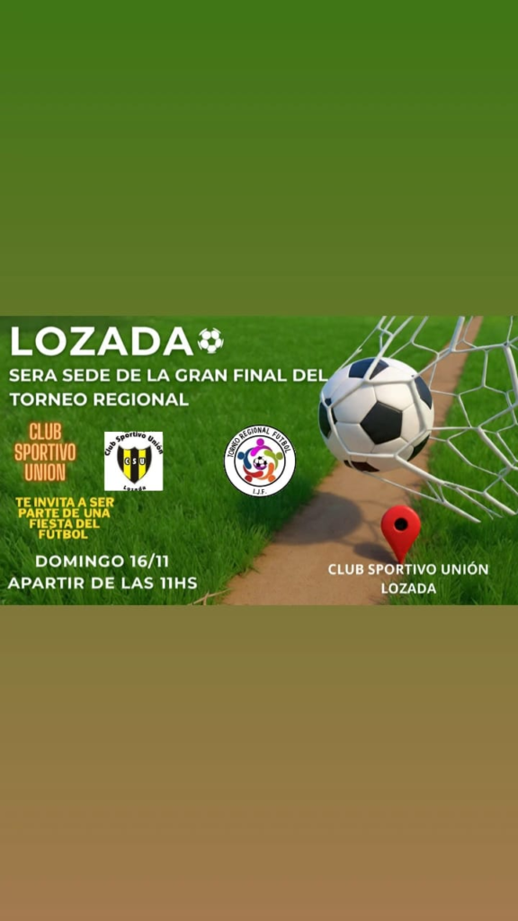 Este domingo 16 de noviembre desde las 11 hs, el Club Sportivo Unión de Lozada será el escenario de una jornada imperdible: las finales del Torneo Regional. Una verdadera fiesta del fútbol infantil y juvenil, donde el esfuerzo de todo un año se verá reflejado en cada jugada.