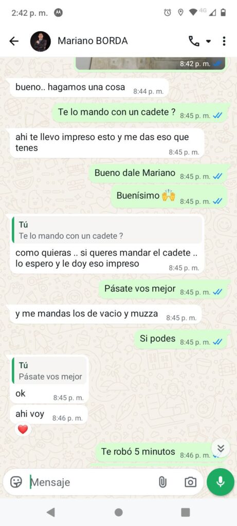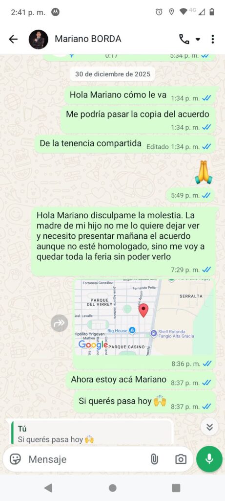 Respecto al episodio de los alimentos, el abogado aclaró que “estos no estuvieron vinculados a la causa de familia, sino a una consulta por un proceso de desalojo iniciado contra Emanuel tiempo después”. En ese marco, sostuvo que “informó previamente el costo de la consulta y que fue el propio Emanuel quien ofreció abonar parte de los honorarios con pastas, quedando incluso una deuda pendiente”. Aseguró que “la entrega de la copia del acuerdo no estuvo condicionada a ese pago y que, de hecho, siempre facilitó la documentación a su cliente”.