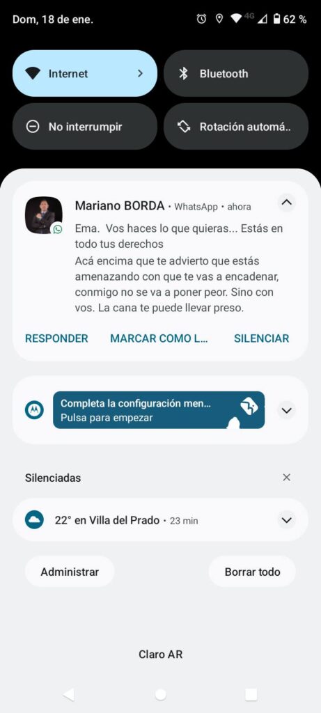En relación a los mensajes que Emanuel interpretó como amenazas, el letrado afirmó que “su intención fue advertirle sobre las posibles consecuencias legales de reiterar conductas como encadenarse en la vía pública, remarcando que podría derivar en intervenciones policiales por disturbios o intimidaciones, y no en una amenaza personal”.