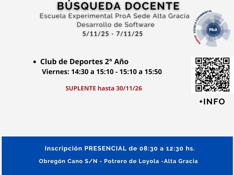 La Escuela Experimental ProA – Sede Alta Gracia (Desarrollo de Software) abrió una convocatoria docente para cubrir un cargo suplente en el espacio curricular “Club de Deportes – 2º Año”.