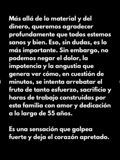 Más allá de lo material, el impacto emocional fue profundo. “No podemos negar el dolor, la impotencia y la angustia que genera ver cómo, en cuestión de minutos, se intenta arrebatar el fruto de tanto esfuerzo, sacrificio y horas de trabajo construidas por esta familia con amor y dedicación a lo largo de 55 años”, expresaron.