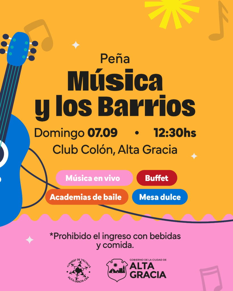 Este domingo 7 de septiembre, desde las 12:30 horas, el Club Colón de Alta Gracia será escenario de una nueva edición de la Peña “Música y los Barrios”, un evento que reúne música en vivo, academias de baile y un esmerado servicio de buffet y mesa dulce.