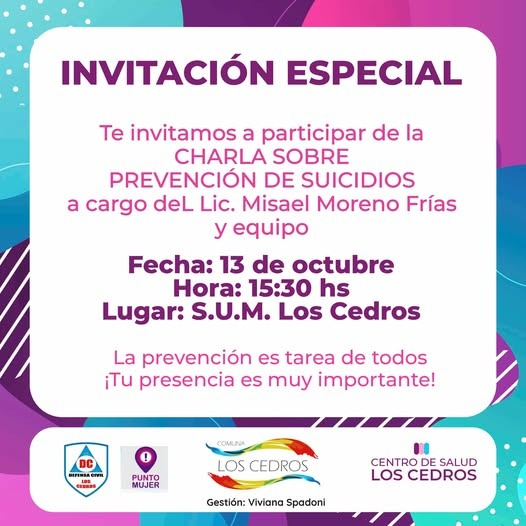 Este lunes 13 de octubre, a las 15:30 hs, se realizará una charla sobre Prevención de Suicidios en el S.U.M. de Los Cedros, a cargo del Lic. Misael Moreno Frías y su equipo.