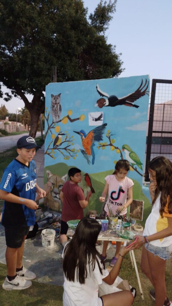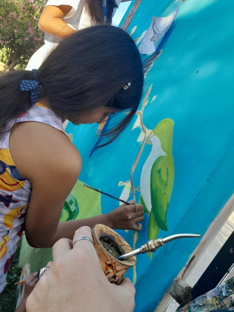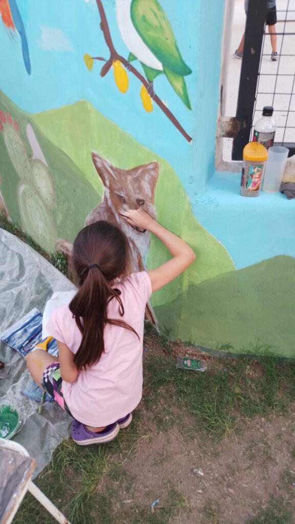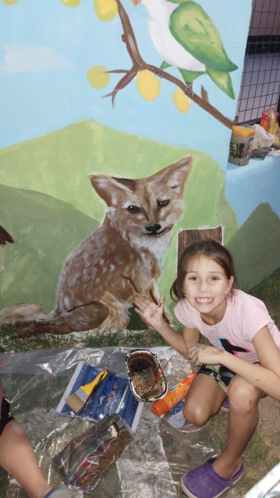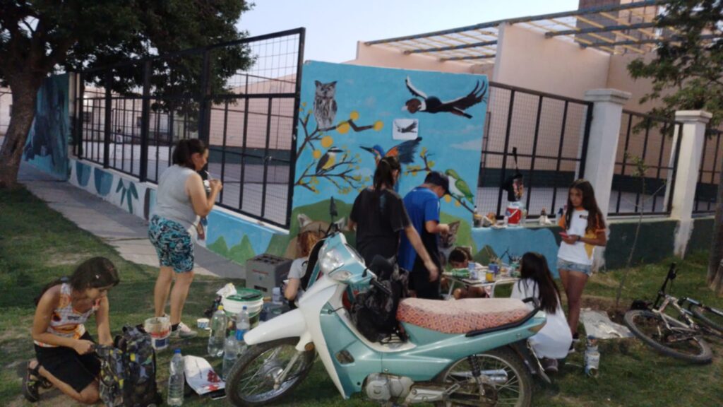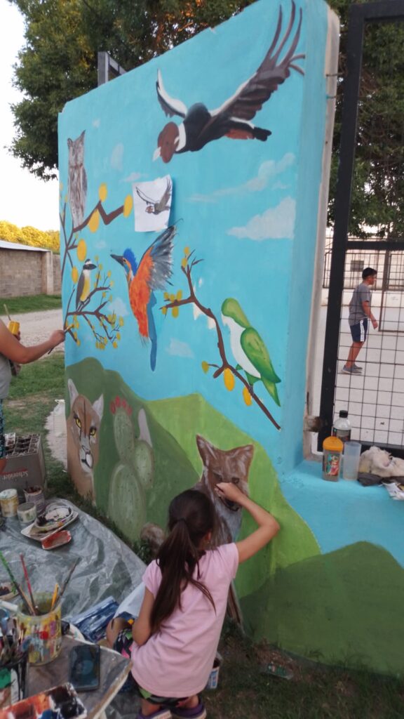 Sí, sí, tenemos en proyecto seguir pintando e interviniendo. Esta fue nuestra primera experiencia con la/os niña/os. Ya habíamos hecho alguna vez un encuentro de muralistas en la biblioteca y hace como diez años por lo menos, así que tenemos ganas de abrir el portal, que ya abrió otro amigo nuestro, muy querido que es Alem, que fue interviniendo con sus murales superficies del pueblo y nosotros queremos hacer lo mismo con los chicos del taller. Por supuesto que siempre van a estar presentes las cuestiones que tienen que ver con la naturaleza. Eso va a ser una constante. O sea, el cuidado de la naturaleza va a ser siempre nuestro late motive porque los tiempos de la naturaleza hoy en día están muy jugados y desde el arte nosotros queremos compartir con la comunidad un mensaje de conciencia extrema más sobre todo por la índole histórica que tiene nuestro pueblo como un gran referente de la lucha por un ambiente sano en relación a la histórica lucha con respecto a la instalación del basural; queremos seguir también esa esa huella y proponer desde las paredes conciencia acerca de “qué hacemos con nuestro consumo”, “qué hacemos con nuestra basura”, “qué hacemos con nuestro ambiente”, personal… familiar, social, cultural y natural.
