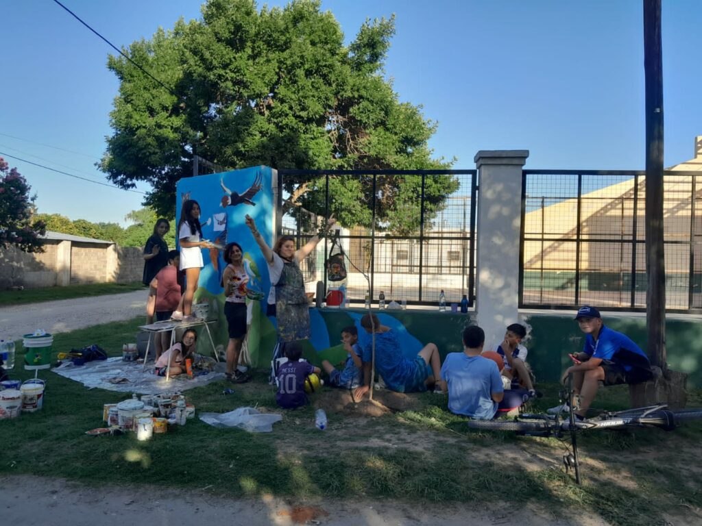 La docente y artista Paula Galbani junto alumna/os de su taller llenaron de vida la esquina de Avenida Brochero y calle 4 con un mural que pone al medioambiente en el centro de la escena. La idea, relató, es que esta obra se convierta en el puntapié inicial a lo que será una serie de intervenciones urbanas en la localidad.