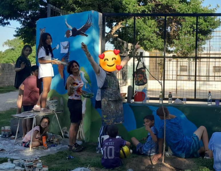 Desde hace un año que me trasladé a una casita propia que tenía las dimensiones suficientes como para montar un taller de arte para niños, niñas, adolescentes y adultos y en febrero del año pasado comencé a dar clases del taller de arte “Alas de colibrí”, así se llama, por la canción de Silvio Rodríguez que tiene una letra muy particular en relación a la creación artística, y vinculada con la inspiración. Empecé a trabajar con un grupito pequeño de niña/os y algunos adolescentes, también adultas que se sumaron, y empezamos a transitar este espacio durante el año 2022 de búsqueda, de investigación, de exploración, de juego, de expresión artística a través la de las artes visuales probando distintos materiales, distintos soportes…y cada uno haciendo una búsqueda y una indagación propia acerca de lo que quería desarrollar. Porque no todos desarrollaban la misma tarea sino que cada uno iba explorando lo que más le gustaba. Ya sea por el lado del cómic, ya sea por la pintura de la naturaleza viva, el trabajo de anatomía y rostro, lápiz, acuarela, témperas, acrílicos, crayones, todas las técnicas habidas y por haber fuimos explorándolas hasta culminar con un trabajo para los chicos y chicas mayores de 10 años con el que encaramos este proyecto de pintar un mural ahí en esa esquina que previamente habíamos solicitado el permiso para intervenirla.