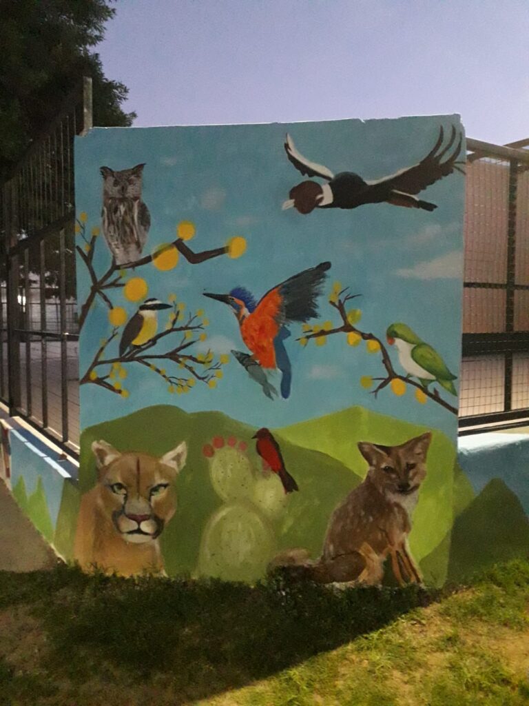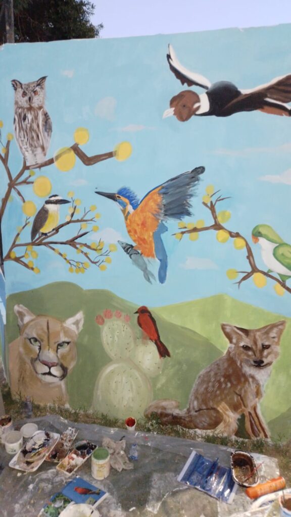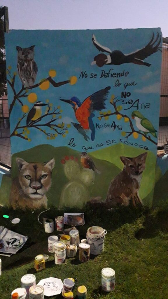 La idea fue intervenirla con un motivo que tuviera que ver con un mensaje para la comunidad, un aporte a la comunidad y coincidimos todos en propiciar un espacio para un mensaje ecologista que tuviera que ver con el cuidado de la naturaleza, con la valoración, sobre todo de la naturaleza en relación al conocimiento de algunas especies nativas en flora y fauna. Falta terminarlo pero el lema del mural que estará también pintado dentro de poco será ese: “No se defiende lo que no se ama y no se ama lo que no se conoce”, es una frase atribuida a diversos supuestos autores pero nos pareció pertinente y atinada con lo que queríamos decir que tenía que ver con dar a conocer algunas de las especies más emblemáticas…son tantas, ¿No?, es difícil elegir, pero bueno, cada uno eligió una especie en flora y fauna para desarrollar en el mural.