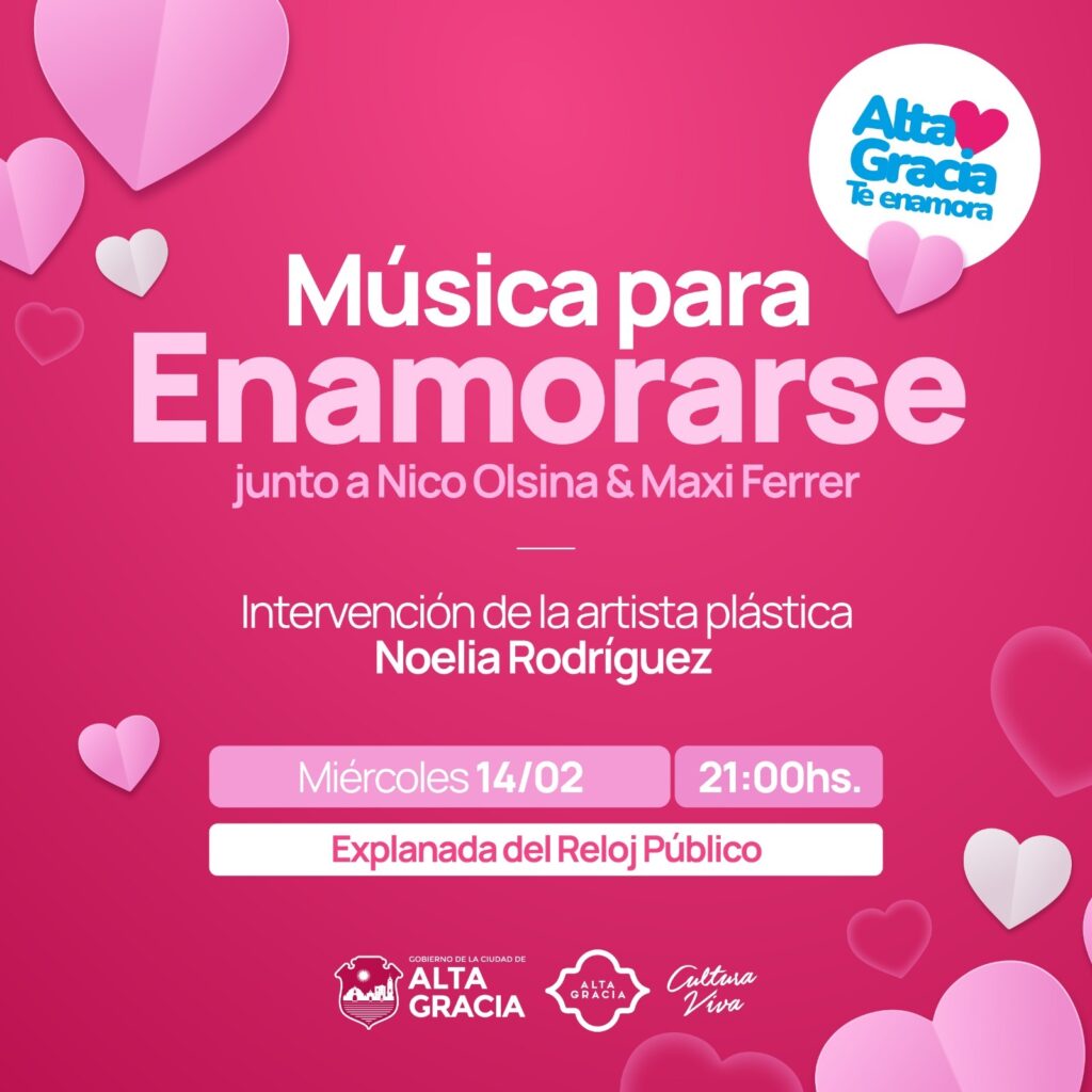 DÍA DE LOS ENAMORADOS – La explanada del Reloj Público se llenará de arte y música para enamorarse, con las actuaciones en vivo de Nico Olsina y Maxi Ferrer; e intervenciones de pintura en vivo de mano de la artista plástica Noelia Rodríguez. Reloj Público, a partir de las 21hs.