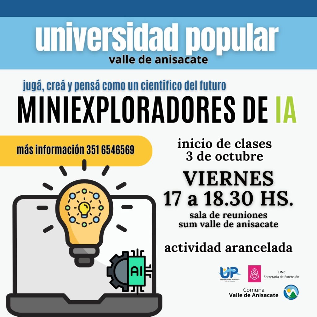La Universidad Popular Valle de Anisacate anuncia el inicio del taller “Miniexploradores de la Inteligencia Artificial”, destinado a niños y niñas de entre 8 y 12 años interesados en descubrir y experimentar con el mundo de la tecnología y la inteligencia artificial.